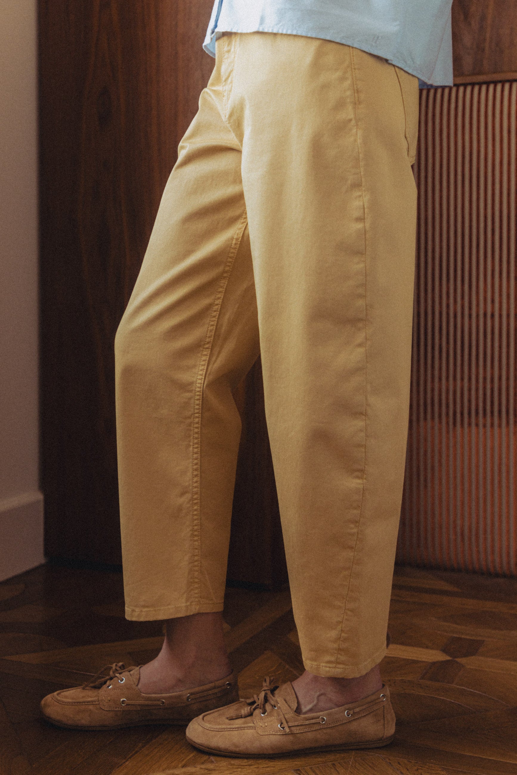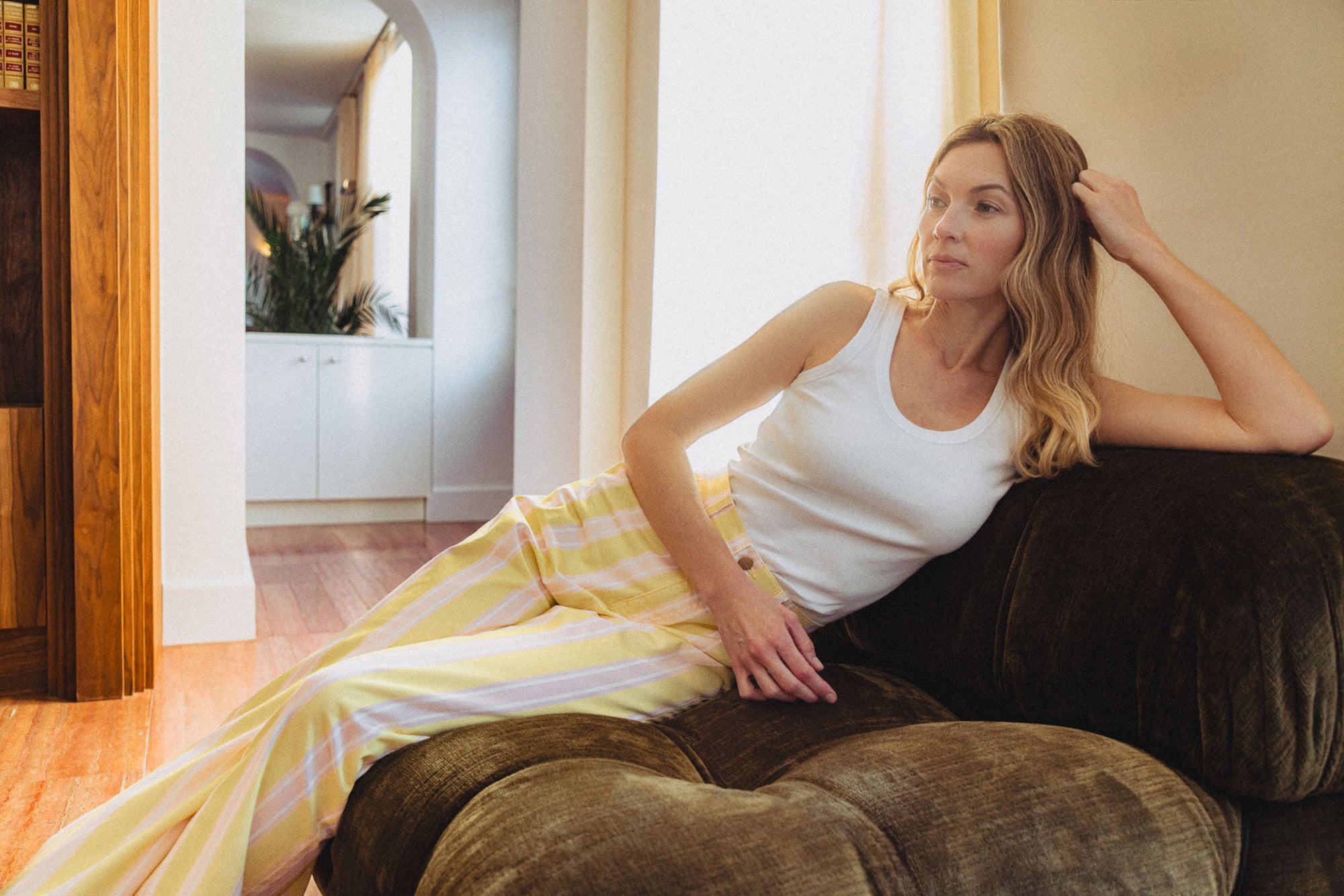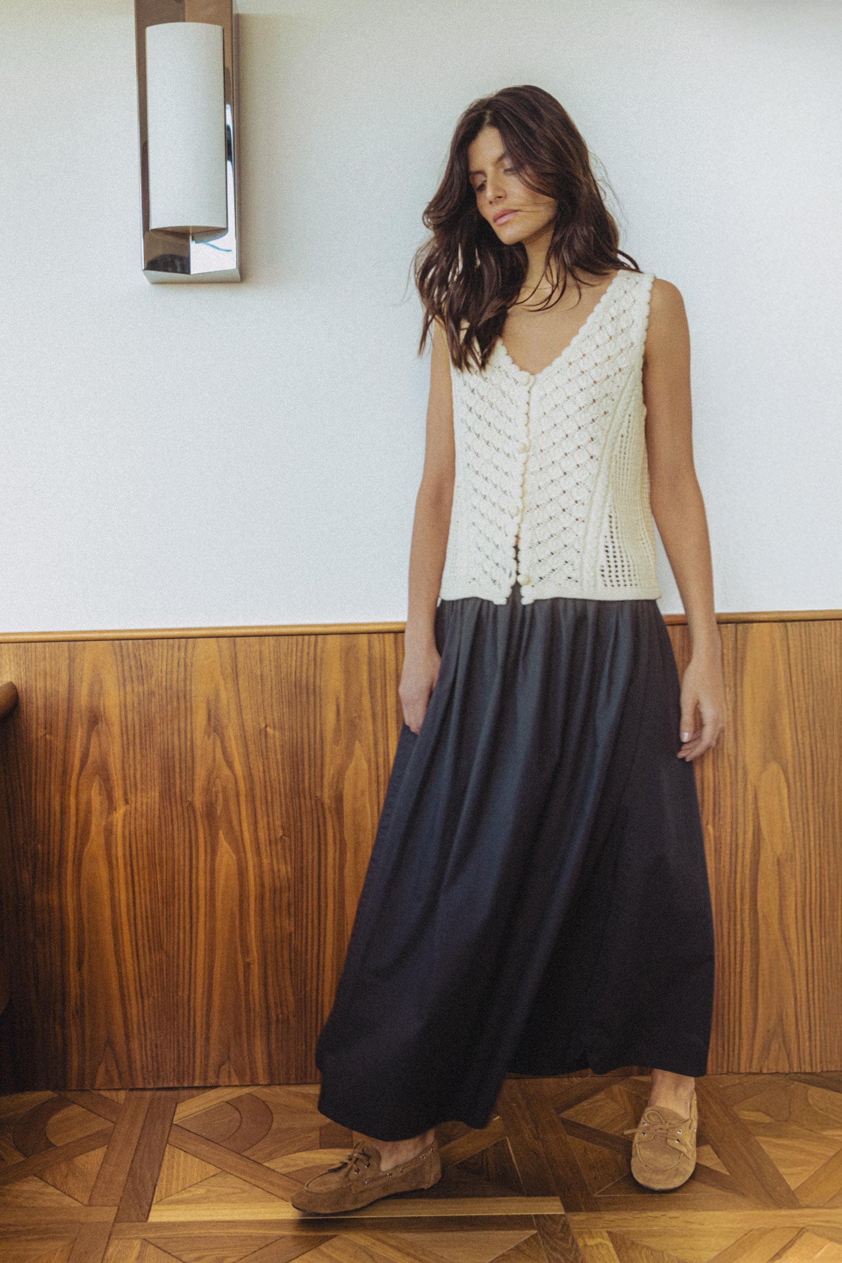 Les silhouettes s’allègent et accompagnent naturellement le mouvement. Portées à même la peau ou en superposition, les pièces révèlent toute la délicatesse de leurs matières, entre la douceur d’une maille ajourée et le relief subtil d’un fil brodé. Le jaune, lui, s’étire sur des lignes fluides et solaires, comme un écho à la lumière nouvelle.