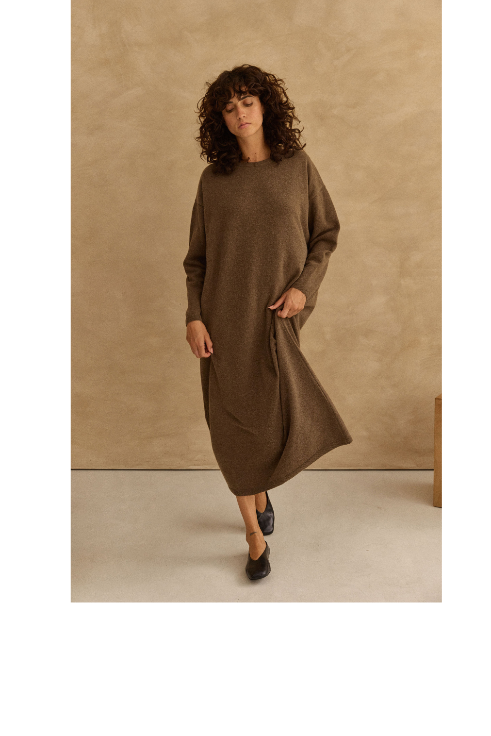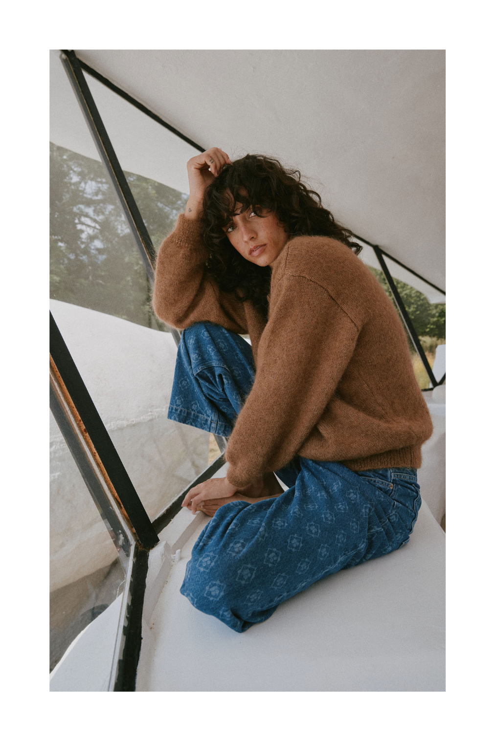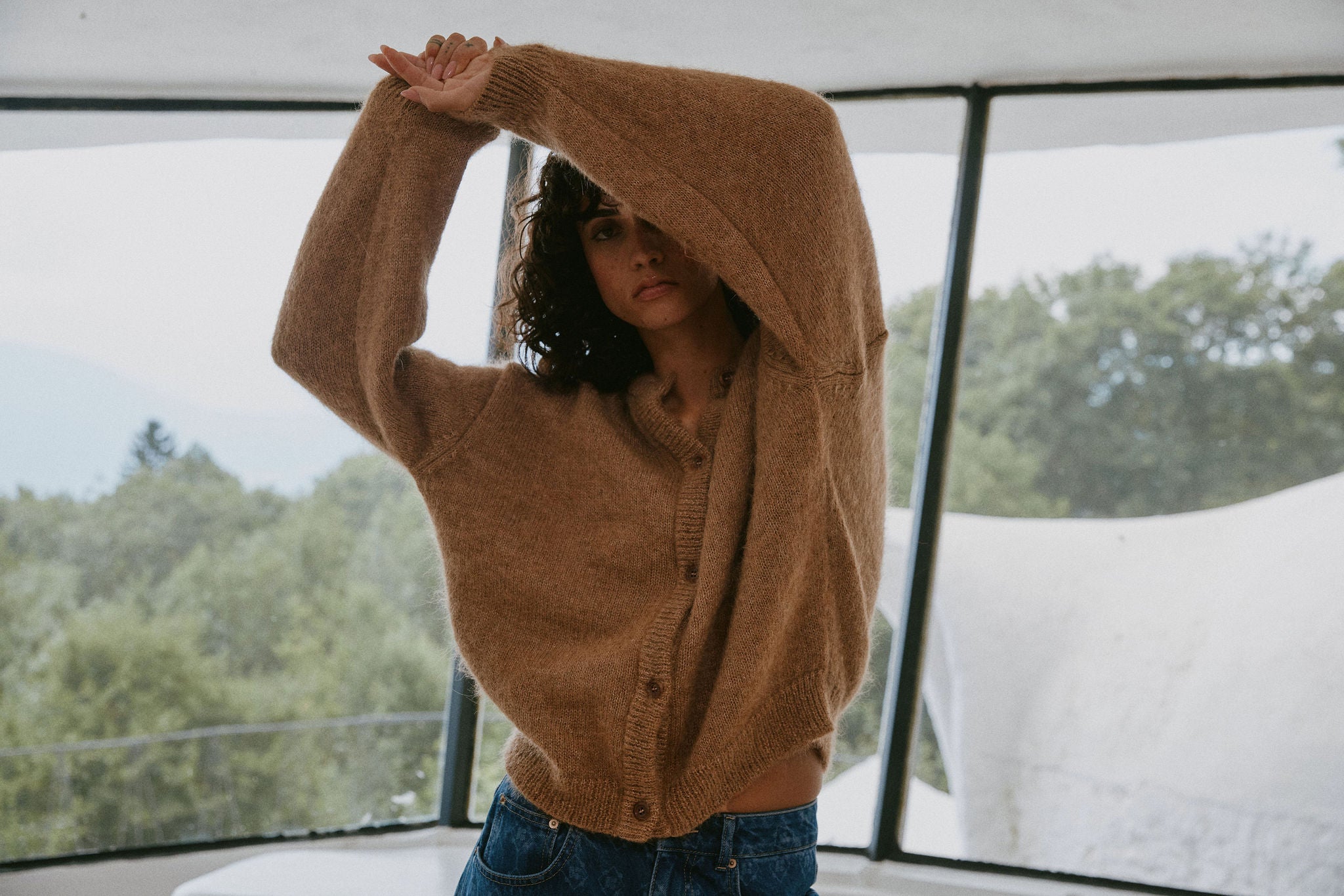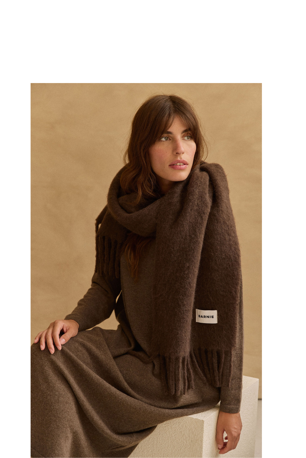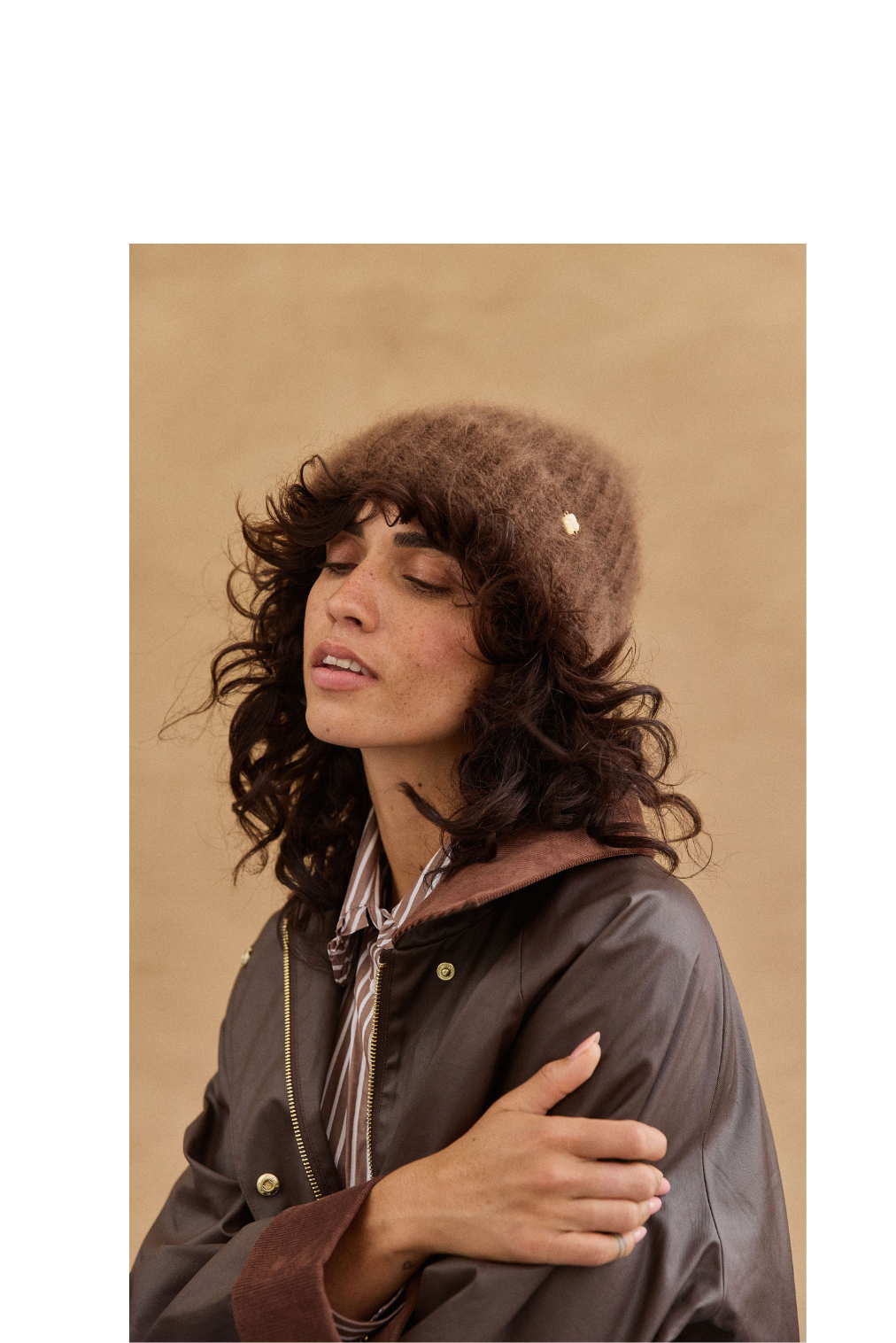 Les silhouettes se redessinent et se muent dans des teintes profondes : bruns chaleureux, bordeaux vibrant, nuances de camels qui réchauffent et qui rassurent. Superpositions délicates et matières nobles composent le théâtre espiègle d’un voyage intérieur, où chaque vêtement devient refuge, chaque maille une étreinte et où l’élégance se suggère sans s’imposer.