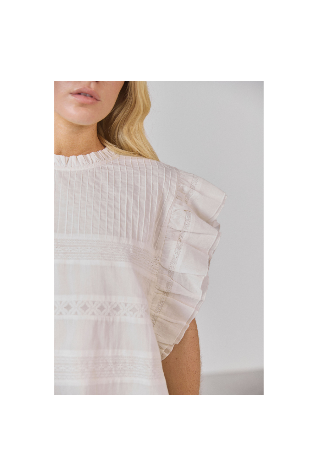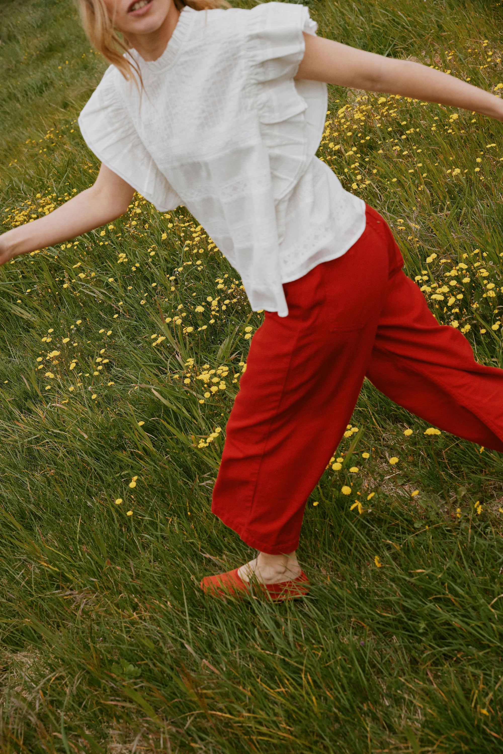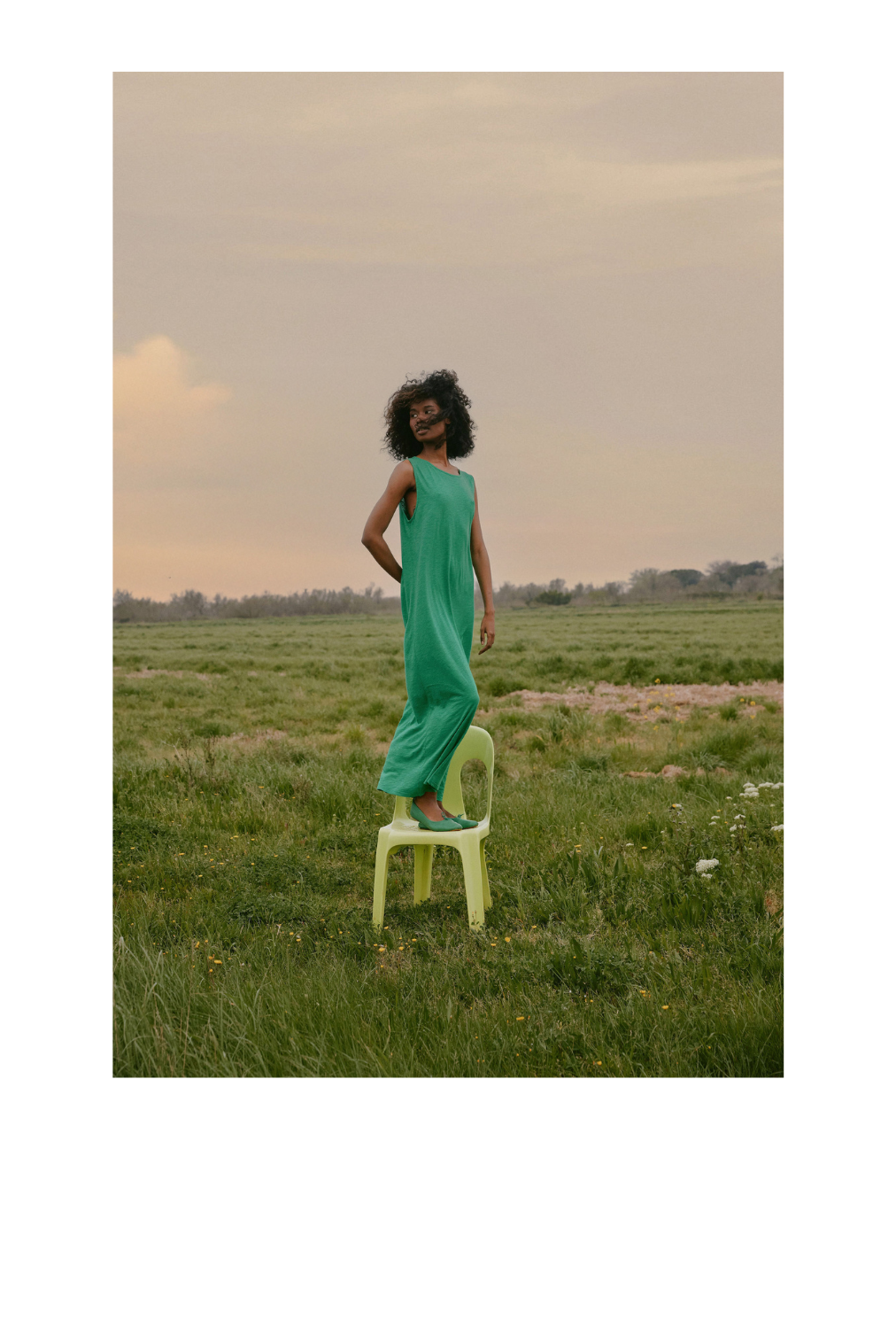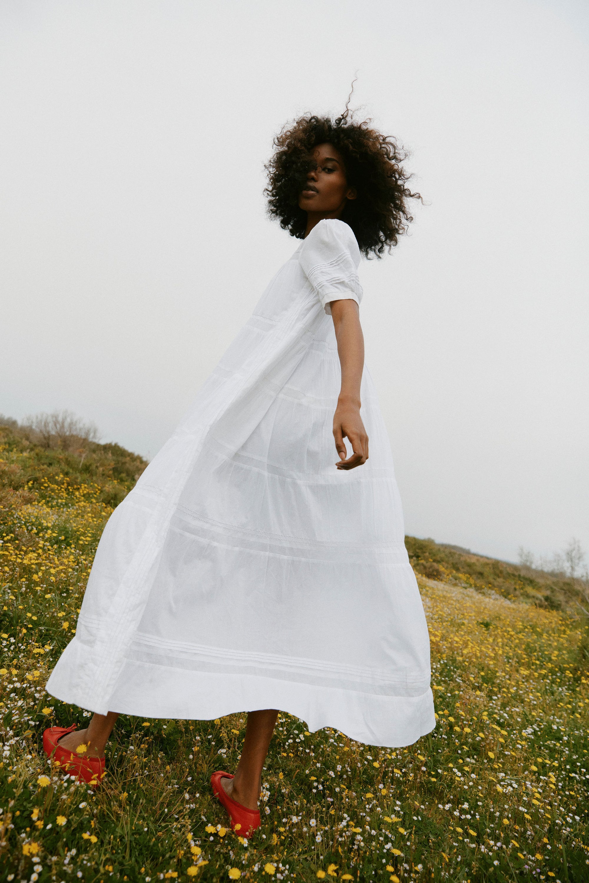 Les silhouettes s’animent, candides, libres et en mouvement, comme bercées par la brise tiède d’une chaude journée. Les broderies s’esquissent avec délicatesse, les coupes se déclinent, les robes élancent et la cadence est donnée.